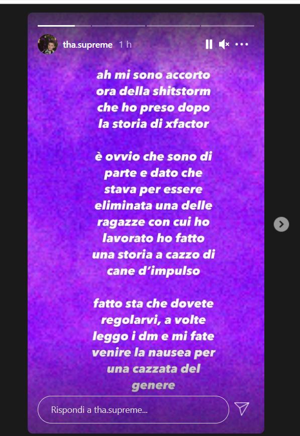 Nelle storie che il giovanissimo -e misterioso- Tha Supreme, uno dei trapper più famosi ed apprezzati in Italia che a soli 19 anni macina numeri straordinari e collaborazioni internazionali, critica tantissimi hater che dopo la sua reazione all’eliminazione di Mydrama da X Factor ha postato.