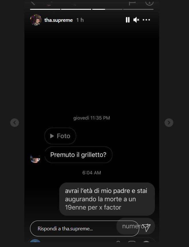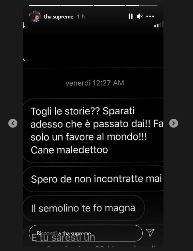 Gli screenshot che ha mandato online circa 1 ora fa sono davvero terribili e lasciano il tempo che trovano. Onestamente qualsiasi altro commento sarebbe superfluo. Addirittura un uomo di circa 50 anni gli ha augurato la morte e lui, che di fatto per età potrebbe essere suo figlio, è rimasto senza parole come del resto tutti noi. Insomma, una vicenda davvero brutto per Davide Mattei, nome d’arte di Tha Supreme di X Factor.