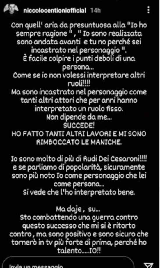 Proprio qualche ora fa è apparso sul profilo Instagram di Niccolò uno sfogo che fa pensare: “Sto combattendo una guerra – scrive lui – il successo mi si è ritorto contro, ma io sono molto di più di Rudi!” queste le parole di Centioni che, però, fanno parte di un’invettiva molto più lunga.
