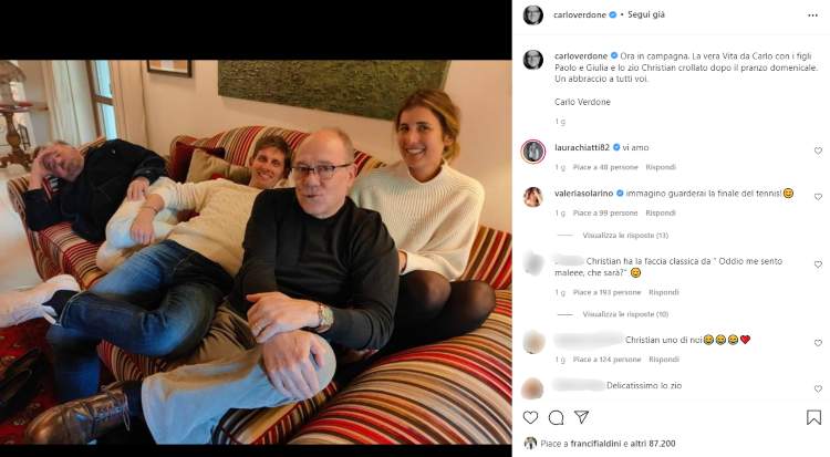 Di chi si tratta? “La vera Vita da Carlo, con i figli Paolo e Giulia – scrive il regista su Instagram – e lo zio Christian crollato dopo il pranzo domenicale”. La foto pubblicata sul suo profilo mostra, infatti, i suoi ragazzi che sorridono all’obiettivo e sullo sfondo, sullo stesso divano, De Sica con un’aria molto provata.
