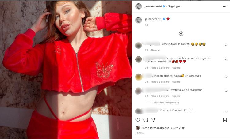 Quasi tutti i commenti alla foto della Carrisi alludono al fatto che nell’immagine appaia particolarmente artefatta. In molti sostengono che Jasmine possa essere ricorsa a qualche “ritocchino estetico” poiché il viso e le labbra sembrano più gonfie e tirate: “Mamma mia, così giovane e piena di botox, ti sei rovinata…” recita un commento e gli altri si uniscono al coro.