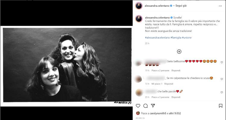 “Sorelle! Credo che la famiglia sia il valore più importante – ha scritto la Celentano – nasce tutto da lì… non esiste avanguardia senza tradizione!” queste le parole della donna che mostra un grande attaccamento nei confronti di sua sorella. Nello scatto si vedono due donne, oltre a lei, possiamo ipotizzare che una sia la sorella Adriana mentre l’altra sia sua madre, poiché non ha mai parlato di un’altra sorella.