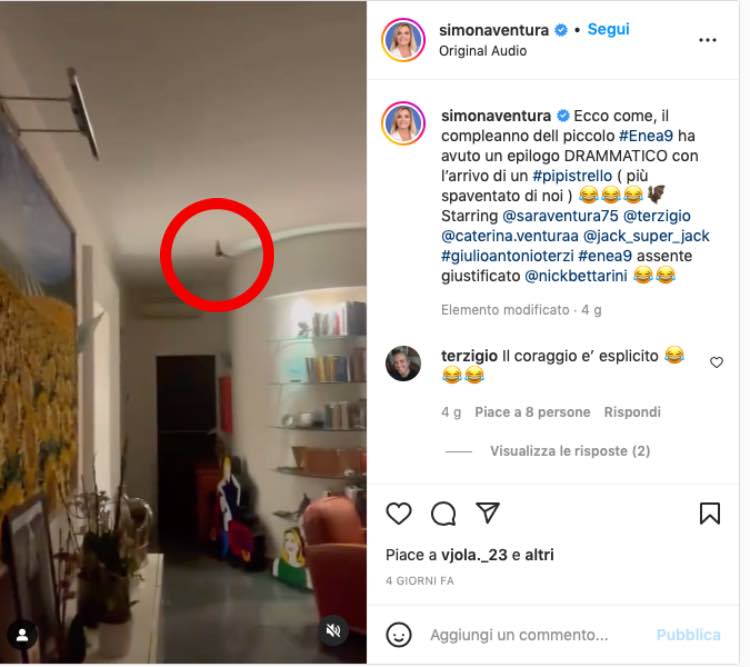 La conduttrice ha provato ad allontanarlo, spegnendo le luci della stanza. Ma non c’è stato niente da fare. Il tutto è stato riportato sul suo profilo Instagram, in cui la conduttrice ha scritto: “Ecco come, il compleanno del piccolo Enea ha avuto un epilogo drammatico con l’arrivo di un pipistrello”.